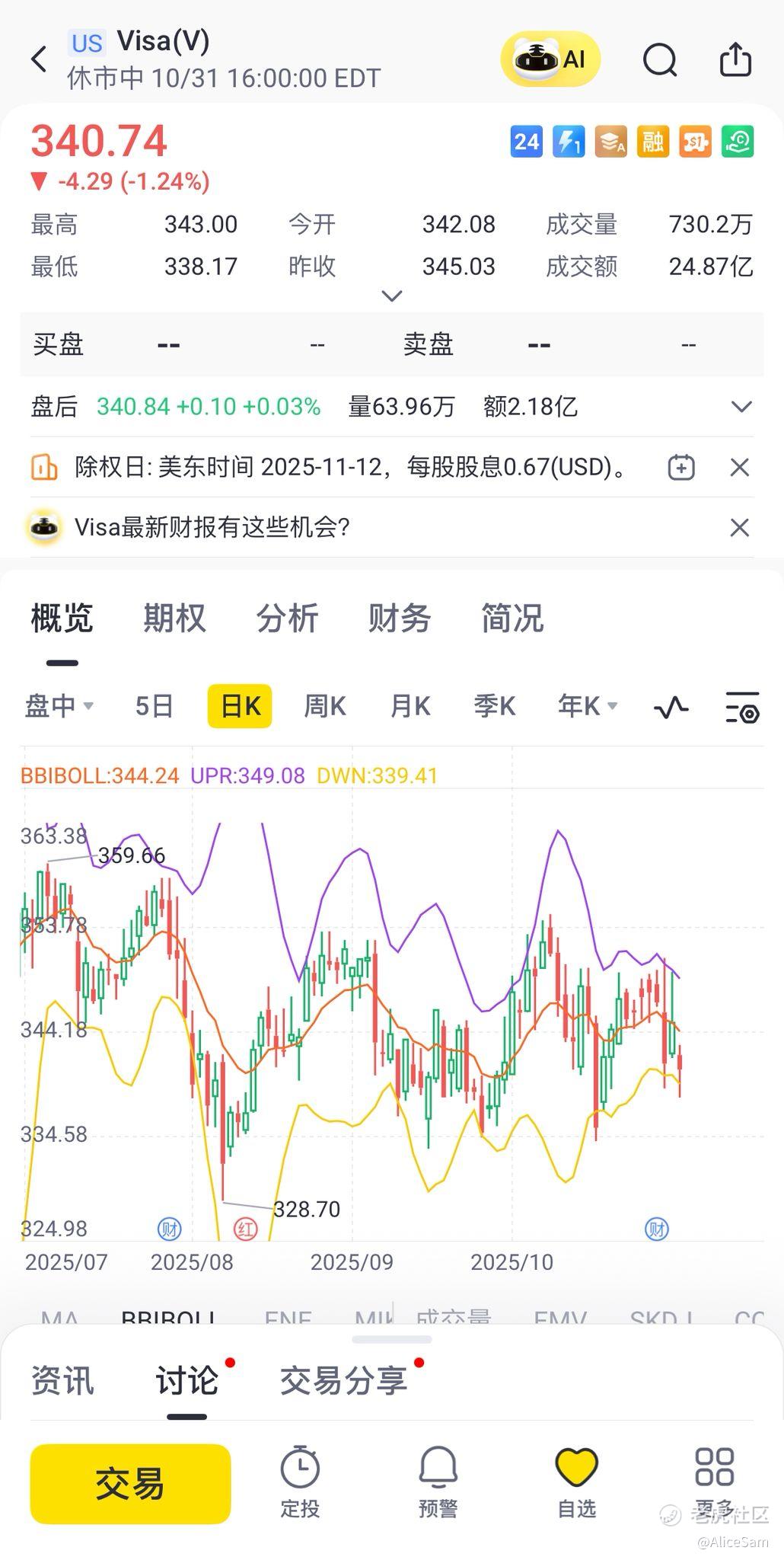 Visa在2025财年持续加大回馈股东力度,全年回购约5400万股A类普通股,耗资182亿美元,平均价格为335.44美元/股。还有,他们董事会宣布将季度分红提高14%至每股0.670美元,这个很吸引人,哈哈 [财迷]。截至2025年9月30日,剩余授权资金为249亿美元。此外,Visa还向诉讼托管账户追加5亿美元资金,以降低未来潜在法律风险对普通股股东的影响。同时,Visa也表达了对AI驱动支付、稳定币清算、实时资金流动等新兴趋势的积极布局意愿。