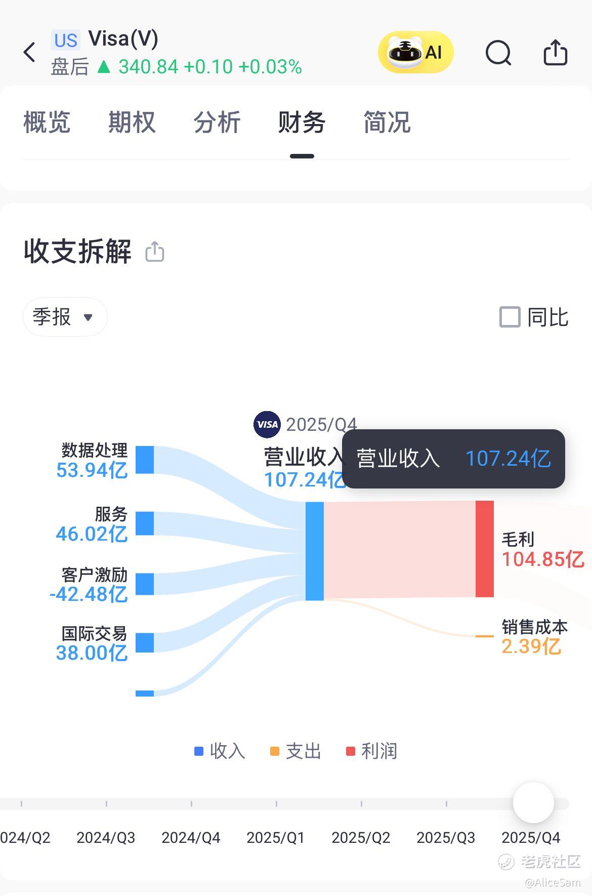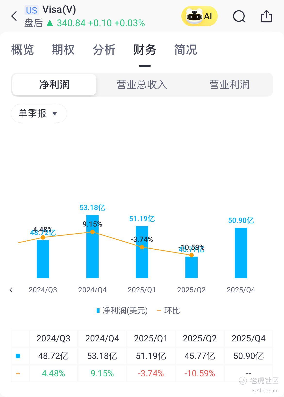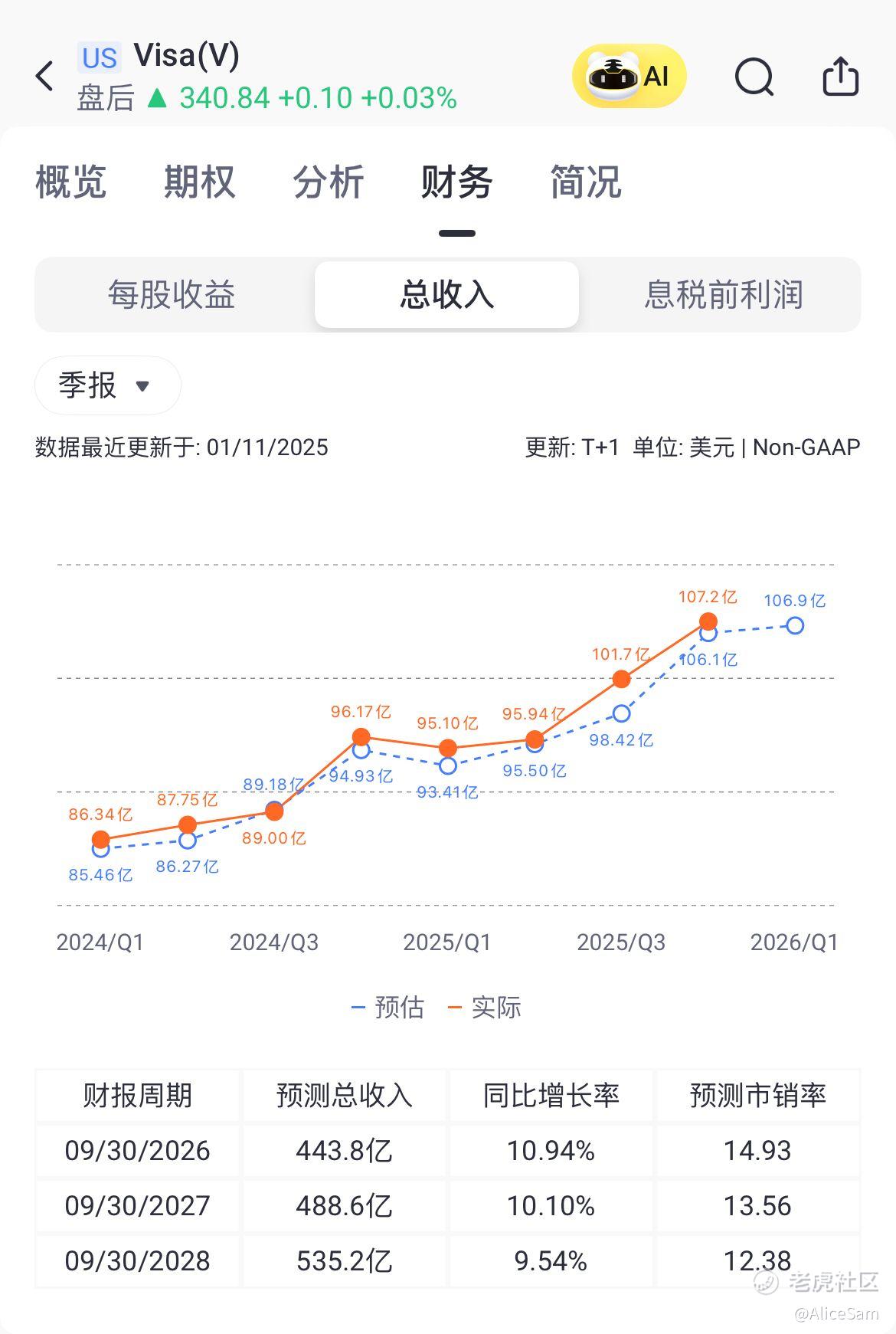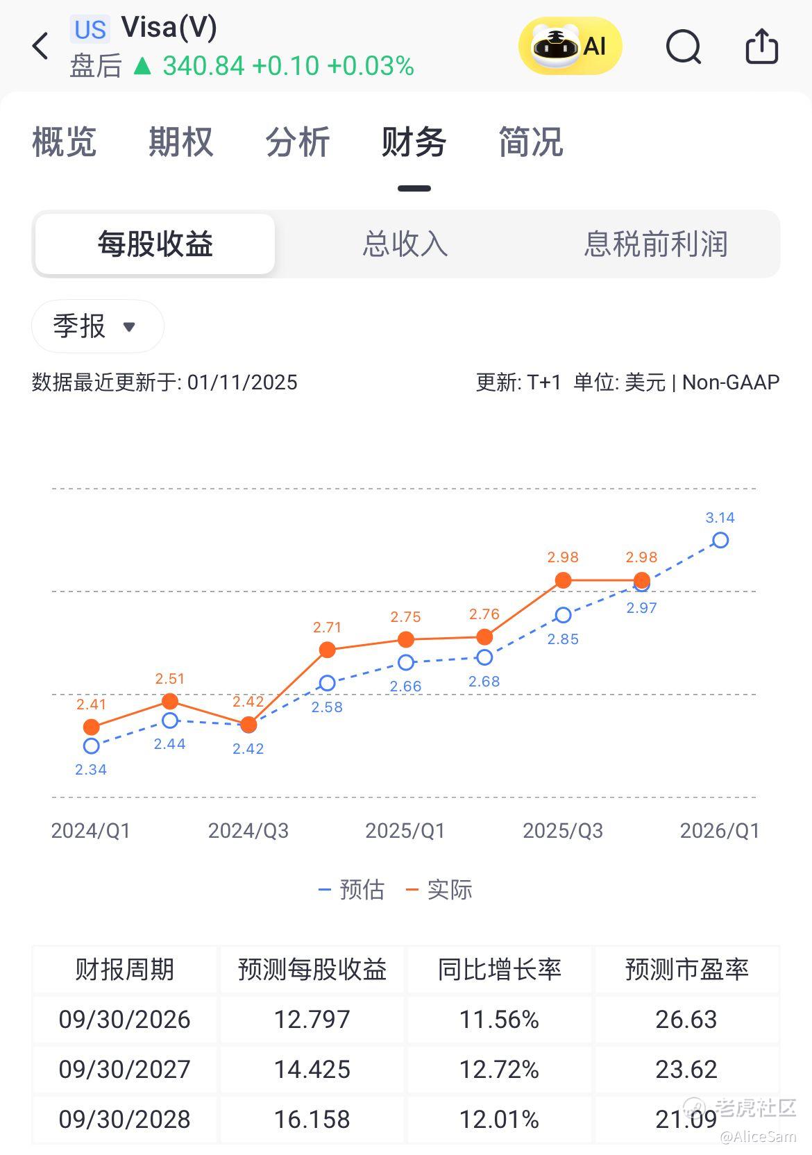 看财报里展示的,Visa2025第四季度(截至2025年9月30日)净营收107.24亿美元,同比增长12%,按固定汇率计算增长11%。全年(截至2025年9月30日)净营收400亿美元,同比增长11%,按固定汇率计算增长12%。看看老虎个股的这个财务对比页面,这是他们连续第五次击败预期,非常稳当的呈现出一个爬升的状态,非常厉害 👍