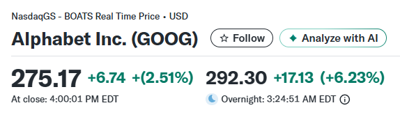 可以看到,AI不再只是成本,而开始成为现金流引擎。投资者因此用脚投票:Alphabet股价盘后飙升6.23%,刷新历史新高。