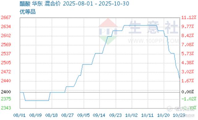 如果我们看一下最近一段时间的醋酸价格走势,你就会发现,从10多天前开始,国内醋酸市场开始了下行趋势。一周的跌幅就接近5%,目前已经低于2470元/吨。