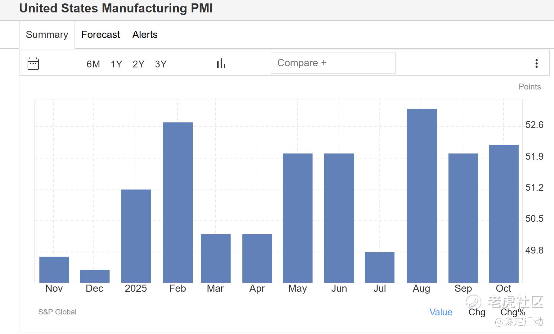 最新CPI与核心通胀均稳定在3%左右,市场预计核心PCE仍在2.8–2.9区间。美国10月制造业PMI从约52.0升至约 52.2,仍处扩张区间;服务业PMI则大幅上升至约 55.2,显示服务业活动加速。 换言之,美国经济既未过热,也没衰退,软着陆仍是主旋律。