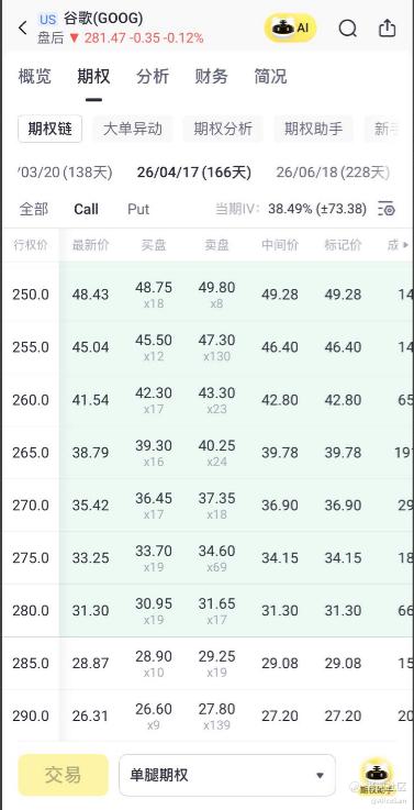 结合这份谷歌的最新财报,考虑了他们的AI驱动增长,Cloud加速,Gemini的商业化,以及谷歌股价走势(突破291后回调),我觉得LEAPS Call这个策略非常不错。我选这个策略的核心逻辑是,他们的基本面够强劲,AI战略落地,Cloud增速34%,Gemini用户数 6.5 亿,我深感长期逻辑是偏多。我在考虑是单腿买入LEAPS Call,如270或280的行权价,大概选2026年04月到期的,还是整一个Call Spread来降低成本,如果这么操作,我觉得买 270的Call,等股价稍微再上升一点,再卖一张310或者320的Call。保证金的压力就不会那么大。[你懂的]