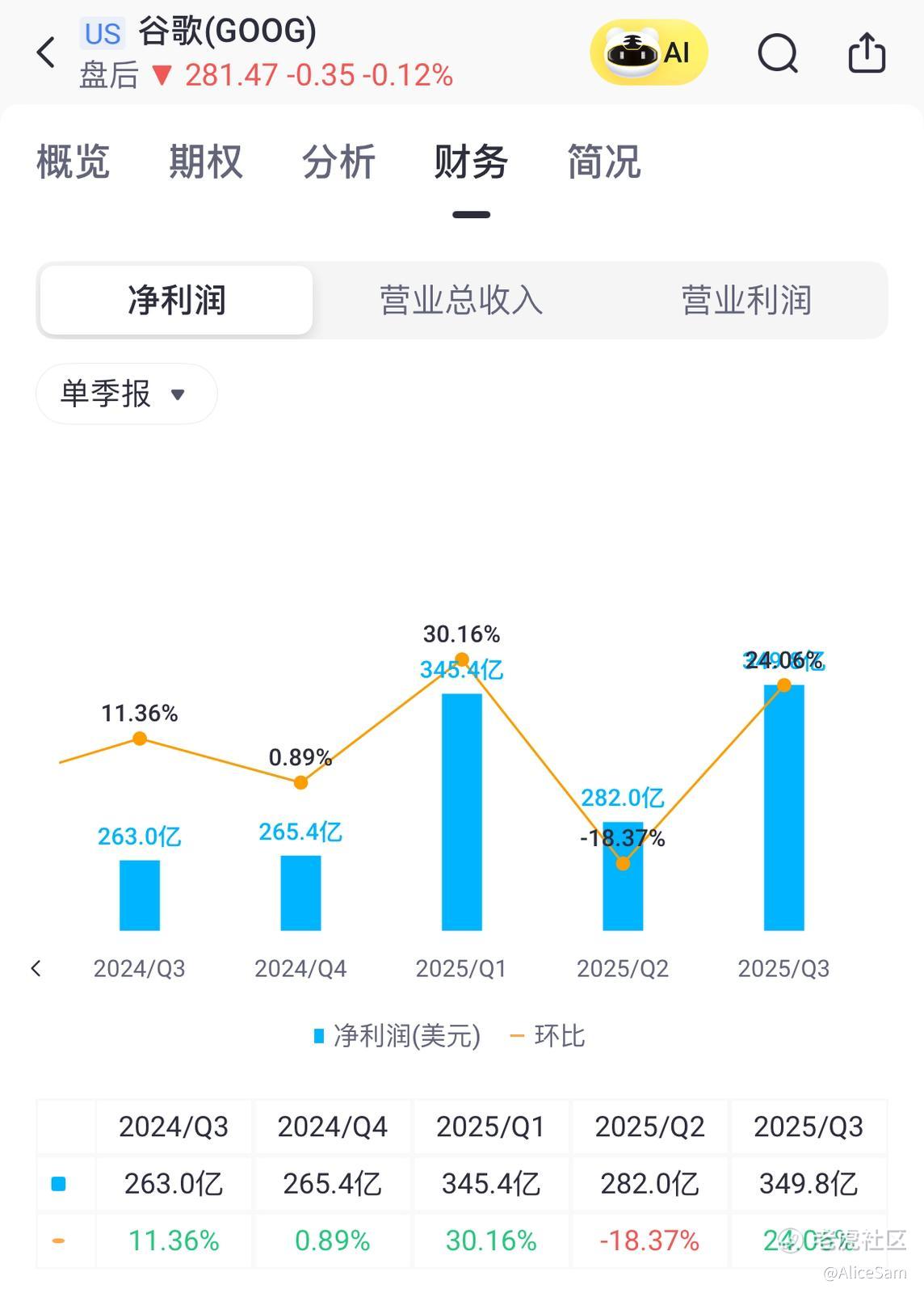 当然,这次谷歌财报的利润表现也非常抢眼,营业利润达 312.3 亿美元,同比增长 9%;若剔除欧盟罚款(35 亿美元),则增长达 22%。净利润达 349.8 亿美元,同比增长 33%。值得注意的是,其他收入项中出现了 128 亿美元的净收益,主要来自非上市股权证券的未实现收益,推动整体利润大幅提升。