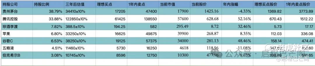 目前十大持仓:贵州茅台39%,腾讯34%,珍酒李渡7%,苹果7%,谷歌6%,五粮液4%,伯克希尔3%。目前九大持仓占比88%(其中科技股占比47%,白酒股占比50%;A股占比43%,港股占比41%,美股占比16%),还有12%观察仓和现金。