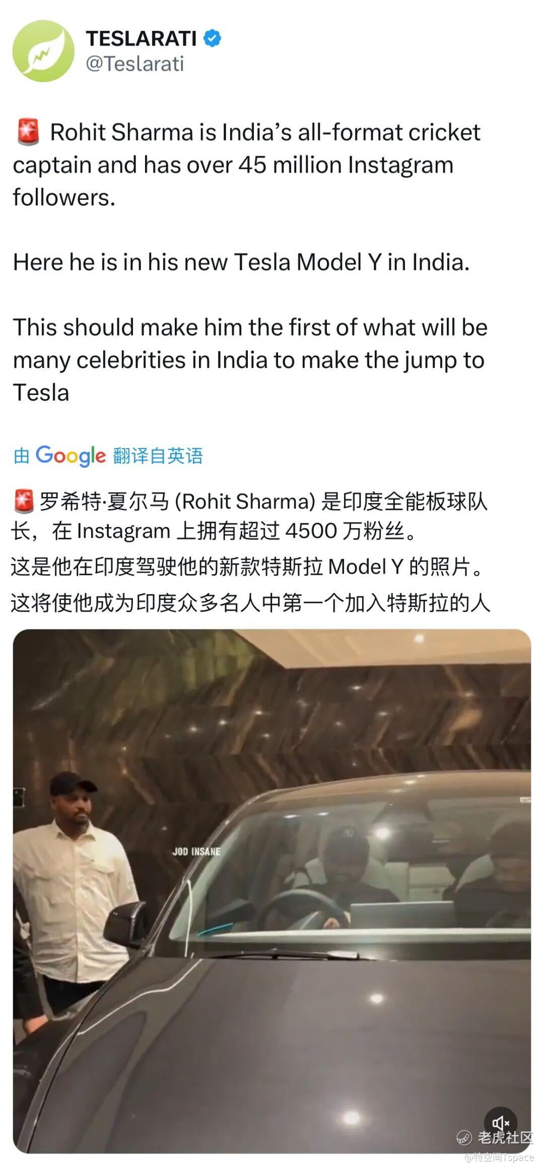 据外媒分享的视频显示,拥有4500万粉丝的印度板球队长罗希特・夏尔马喜提Model Y,成为印度本地众多名人中的首位特斯拉车主。