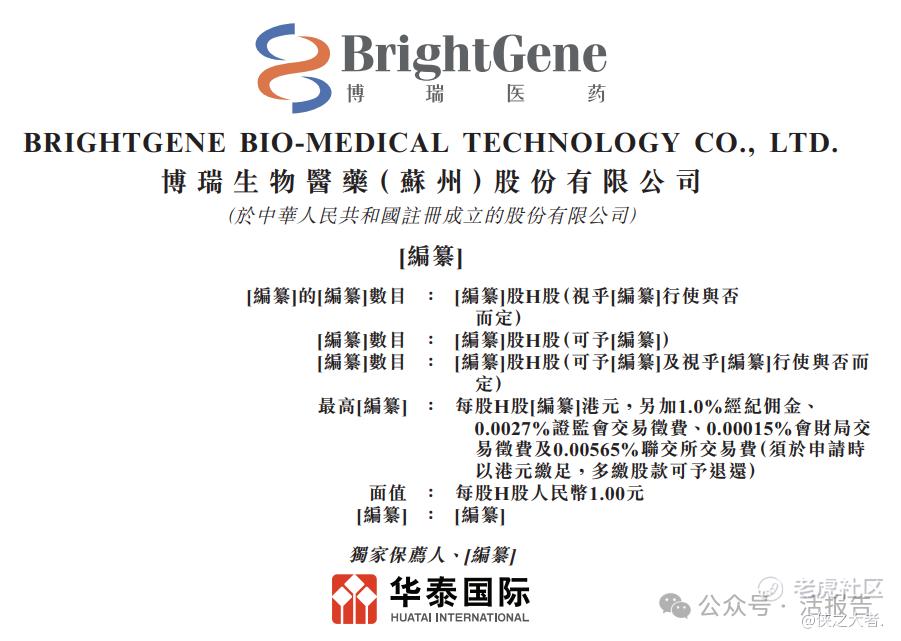 **获悉,瑞生物医药(苏州)股份有限公司 BRIGHTGENE BIO-MEDICAL TECHNOLOGY CO., LTD. (以下简称“博瑞医药”)于2025年10月30日在港交所递交上市申请,拟香港主板上市。这是该公司第1次递交上市申请,独家保荐人为华泰国际。