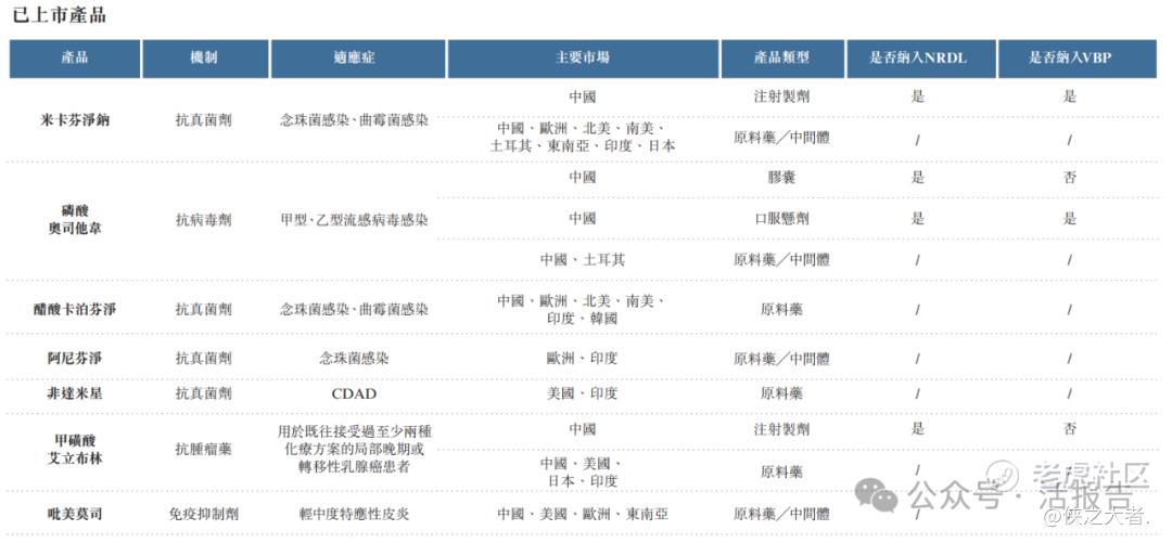 凭借公司强大的技术平台,公司成功开发并商业化种类丰富的产品组合,包括制剂产品及原料药╱中间体。于最后可行日期,公司已成功商业化超过40款药品,其中包括12款制剂产品及29款原料药及中间体,涵盖多个治疗领域,包括感染性疾病、免疫疾病及肿瘤疾病。公司的已上市产品有七款主要产品,每款产品于往绩期间贡献5%以上的收益,或对公司具有战略重要性,该等产品为米卡芬净钠、磷酸奥司他韦、醋酸卡泊芬净、阿尼芬净、非达米星、甲磺酸艾立布林及吡美莫司。