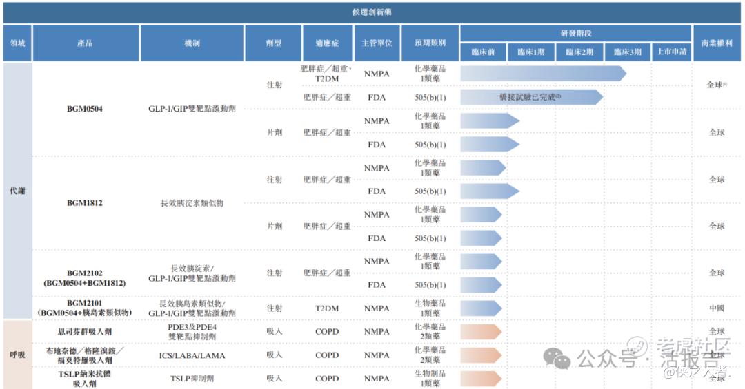 公司的代谢疾病管线以两款领先的创新候选药物为核心:BGM0504(GLP-1/GIP双靶点激动剂)及BGM1812(长效胰淀素类似物),两者均开发了注射剂型及口服剂型,为患者提供最大的用药便利性。在呼吸系统疾病领域,公司正研发具有高进入壁垒的高端吸入式候选产品,这些产品源自公司药械组合技术平台的先进递送系统。除深耕代谢及呼吸系统疾病外,公司亦在其他主要治疗领域(包括感染性疾病、免疫疾病及肿瘤疾病)开发候选产品。截至最后可行日期,公司共有七款主要的创新候选药物。