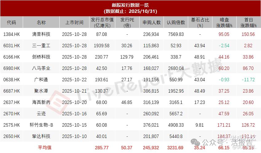 据**大数据,近10家上市新股平均发行市值为285.77亿,最大市值为三一重工,最小市值为挚达科技;平均发行PE为50.37倍,PE处于高位水平;平均申购人数为245,932人,平均认购倍数为3231.69倍;平均基石占比为35.24%,基石平均比例略有回升;