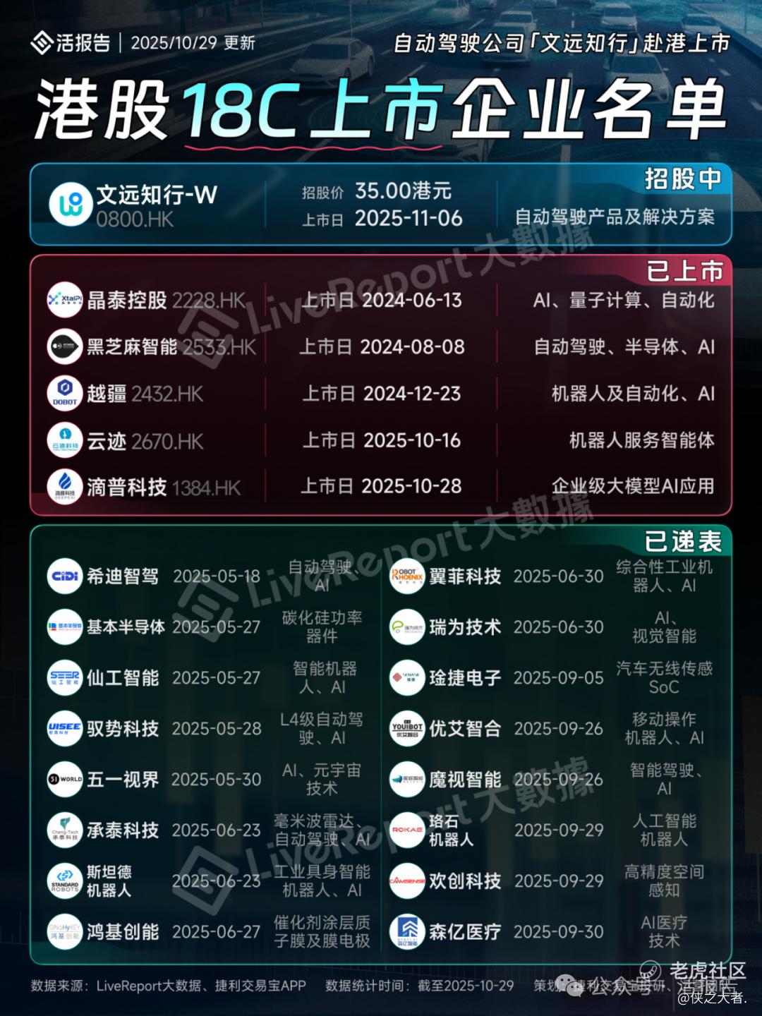 文远知行-W(0800.HK)招股日期为2025年10月28日至2025年11月3日,并预计于2025年11月6日在港交所挂牌上市。