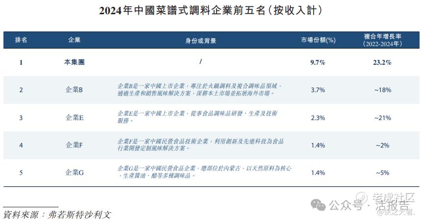 按2024年收入排名,公司位列中国菜谱式调料企业第一位,市场份额为9.7%,约为第二大企业的2.6倍,2022年至2024年期间,公司在中国前五大菜谱式调料企业中,实现了23.2%的最高复合年增长率。