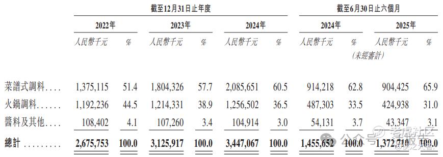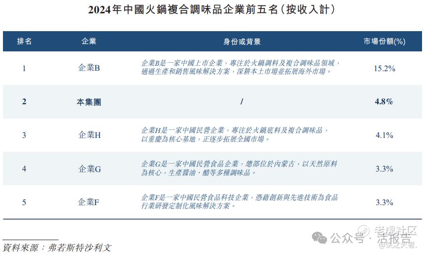 公司是中国领先且快速增长的复合调味品公司。根据弗若斯特沙利文,按2024年收入计,公司是中国第四大复合调味品公司,且是中国前五大复合调味品公司中收入增长最快的公司(2022-2024),此外,公司是中国第一大菜谱式调料及中国第二大火锅调料公司,所占市场份额分别为9.7%及4.8%。