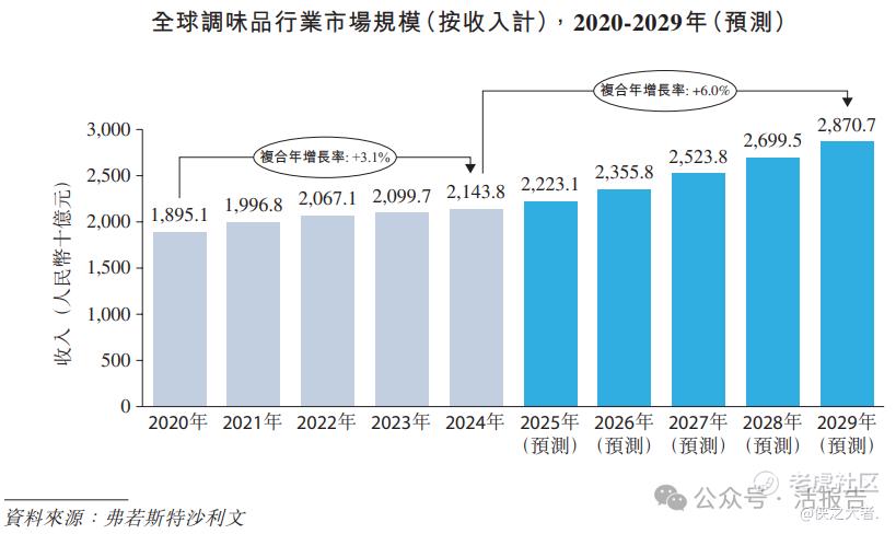根据弗若斯特沙利文(Frost & Sullivan)的报告,按收入计,2024年全球调味品市场规模达到人民币21,438亿元;2020年至2024年,复合年增长率为3.1%;预计到2029年将达到人民币28,707亿元;2024年至2029年,复合年增长率预计为6.0%。