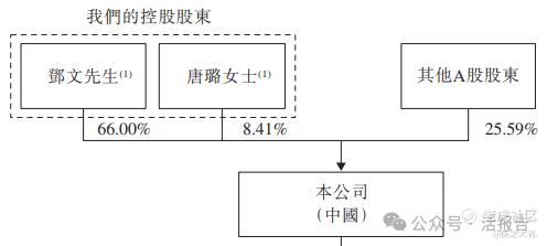 邓文先生直接持股57.09%,并通过合约基金持股9.12%,其配偶配偶唐璐女士持股8.43%,两者合计持股74.64%;其他A股股东合计持股25.59%。