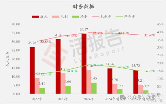 收入分别约为人民币26.76亿、31.26亿、34.47亿、14.56亿、13.73亿,2025年前6月同比-5.70%;