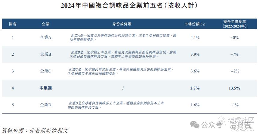 按收入计,2024年公司位列中国复合调味品企业第四位,2022年至2024年的复合年增长率高达13.5%,在国内前五大复合调味品企业中位居首位。