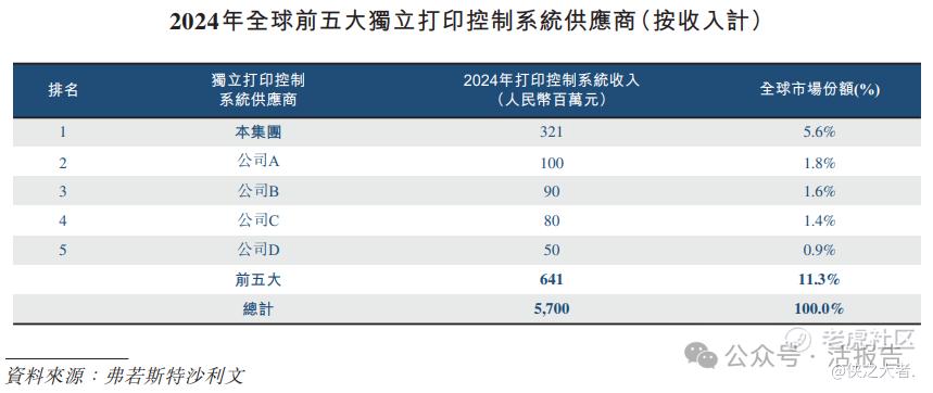 于2024年,按收入计,前五大独立打印控制系统供应商合计占全球打印控制系统市场约11.3%。公司在全球独立打印控制系统供应商中排名第一,按收入计的市场份额为5.6%。