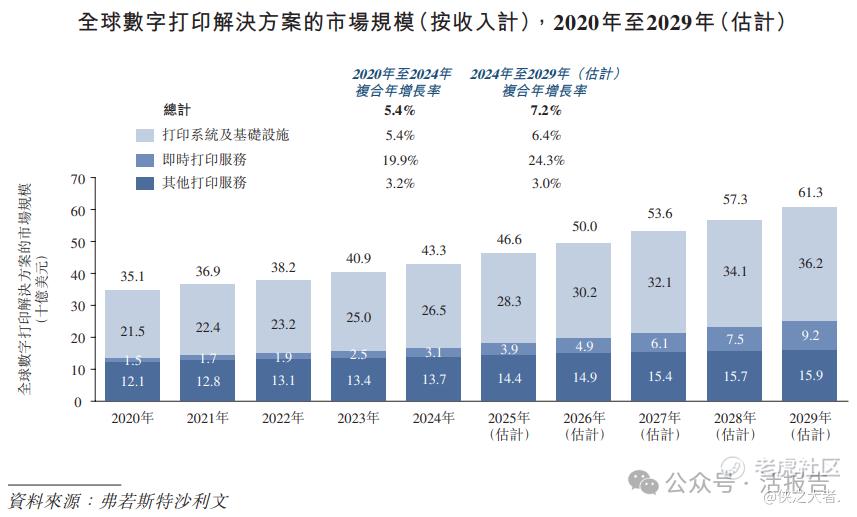 根据弗若斯特沙利文(Frost & Sullivan)的报告,按收入计,全球数字打印解决方案行业的市场规模从2020年的约351亿美元增长至2024年的约433亿美元,复合年增长率为5.4%,预计到2029年将达到约613亿美元,2024年至2029年的复合年增长率为7.2%。