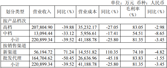 从渠道结构来看,2025年前三季度,公司批发代理营收16.47亿元,同比下降50.5%;新渠道(含电商、团购、O2O等)营收5.62亿元,同比增长71.2%,营收占比提升至25%。