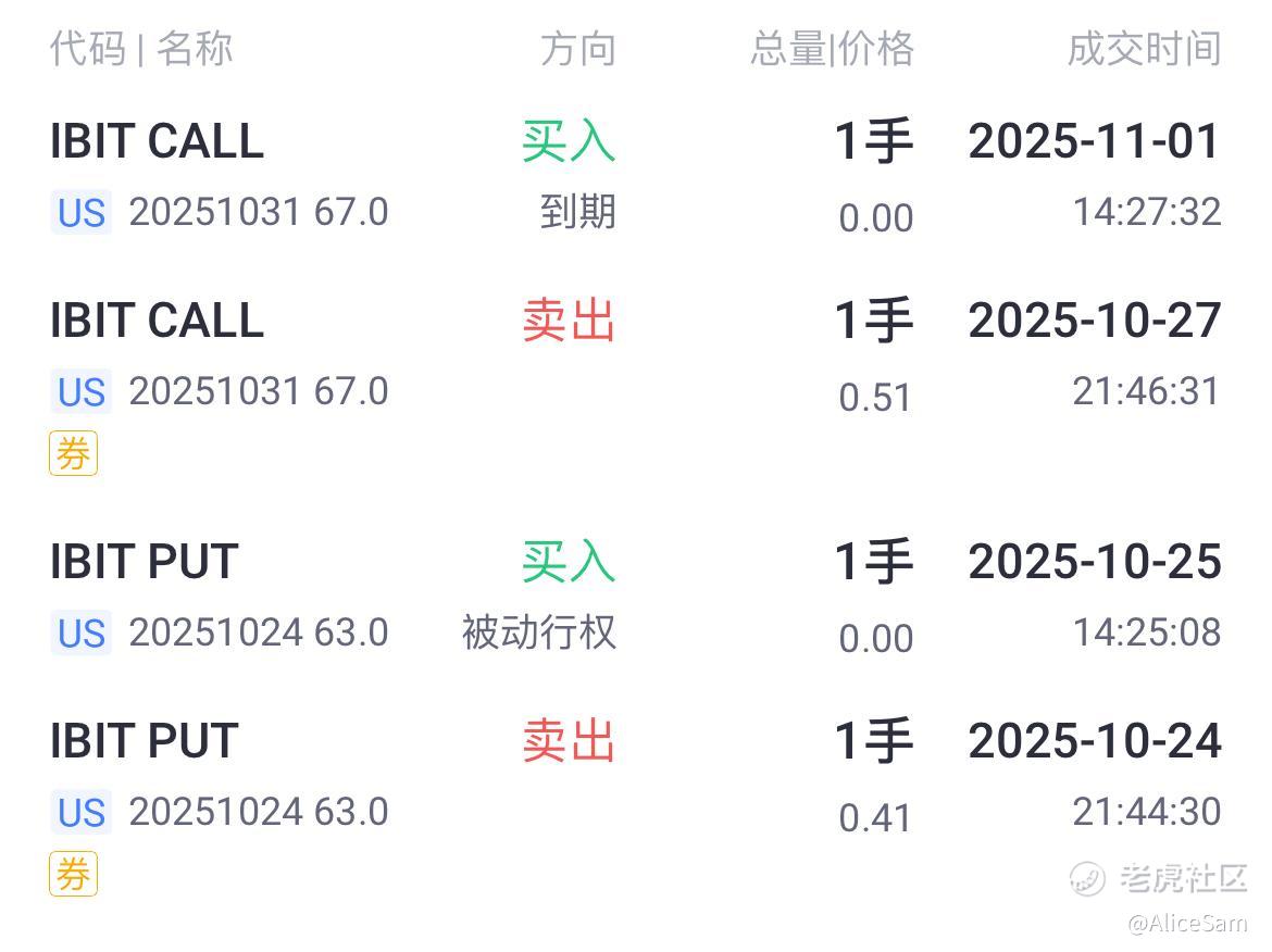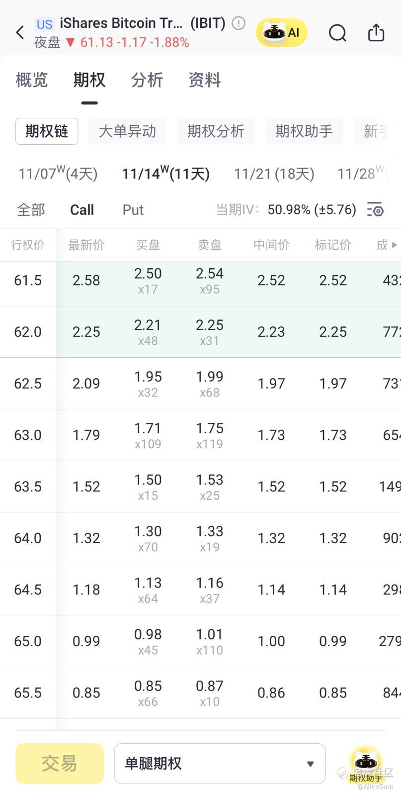 绕回来,针对我的IBIT这个情况,当前价 61,成本 63,跌幅还不是很大,但如果这个股票趋势继续走弱,Covered Call 权利金就会越来越低。我比较看好比特币中长期,所以我可以卖63或64行权价的近月Call,收取更多权利金,降低成本,或者卖 更远到期的66行权价Call,收取时间价值,等待反弹。
