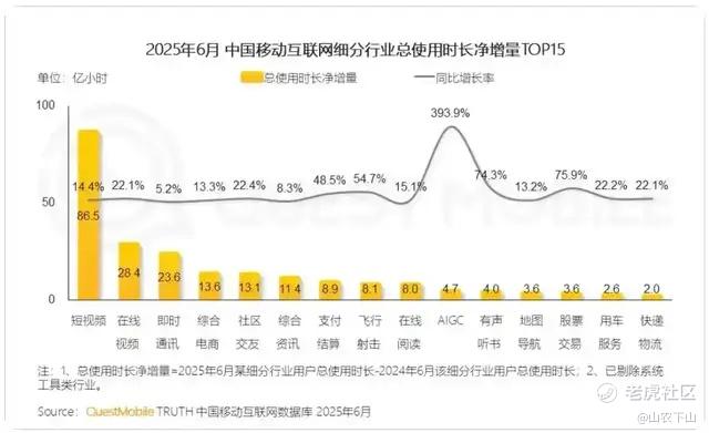 这里不得不插一句题外话:值得注意,AIGC的使用时长正在飞速增长,同比增长率393.9%。如果保持高增速,它有可能很快成为一批黑马,进入头部榜单。目前,美团小美、豆包等等也在尝试植入商品链接,这或许也是电商抢跑的新赛道。我在《“小美”们应该不会走上微软小冰的老路了》一文中对此问题进行分析讨论,感兴趣的朋友可以移步观看。