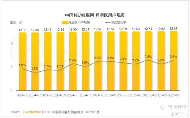 根据QuestMobile发布数据,月活跃用户规模已经达到12.67亿,而据统计局发布会的数据,截至2024年末,中国人口总数为14.08亿。