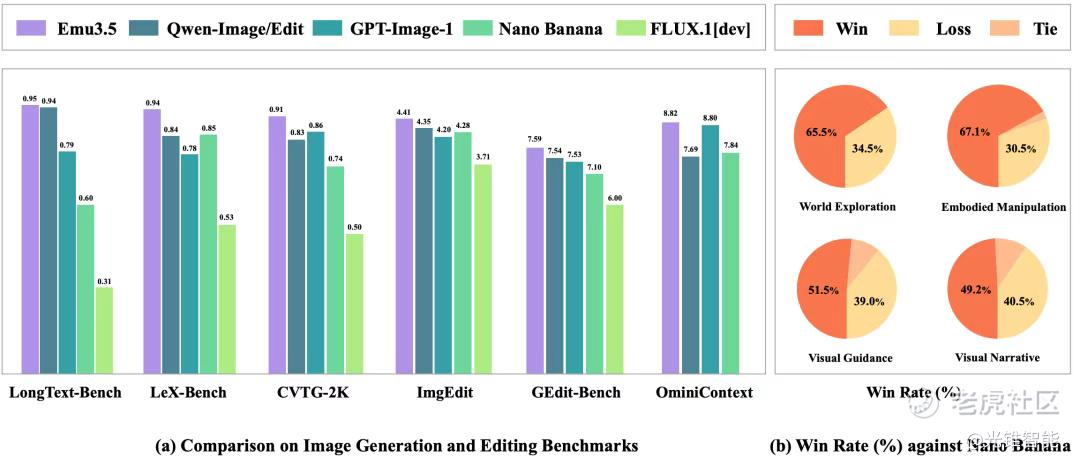 实际测试中,Emu3.5的表现超越了众多知名闭源模型,达到SOTA效果。官方表示,Emu3.5在图像生成和编辑任务上取得了与Gemini 2.5 Flash Image(Nano Banana)相媲美的性能,并在系列图文交错生成任务中展现出更优异的结果。