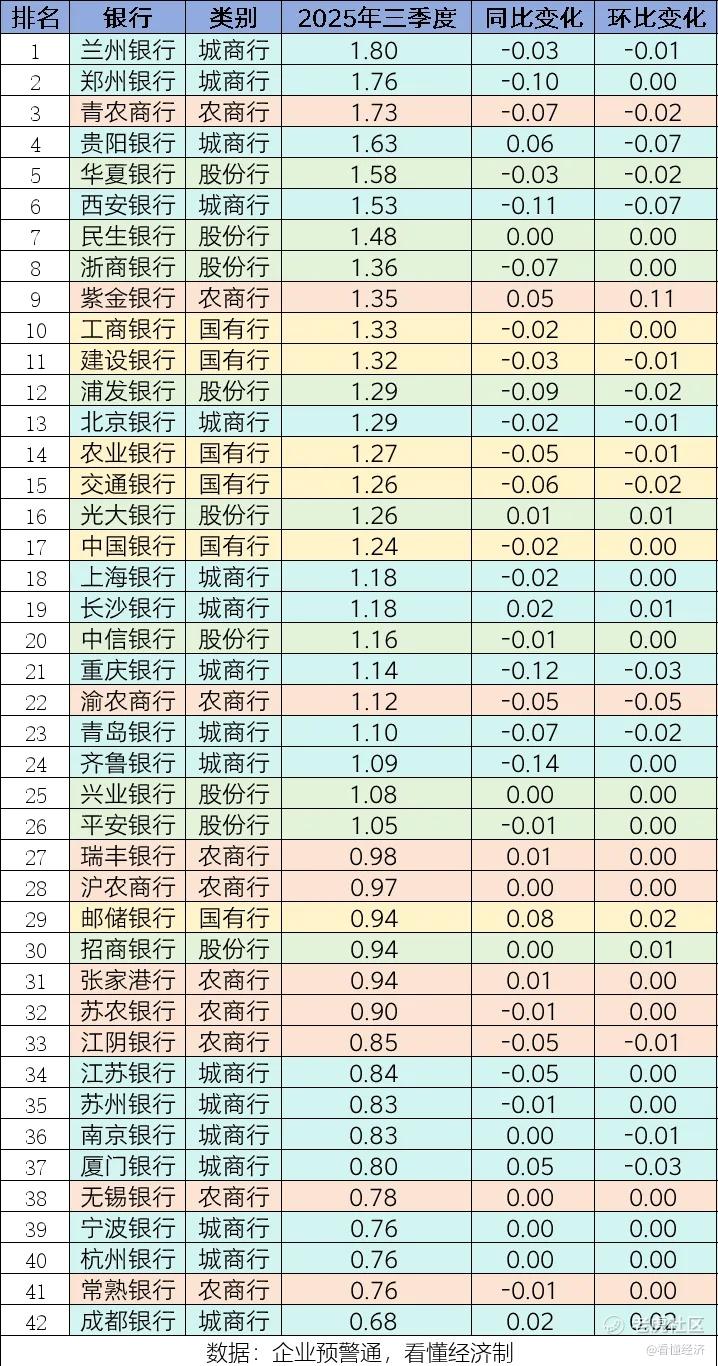 在不良贷款率排名中,资产质量整体可控,但分化同样存在。不良率低于1%的16家上市银行中,国有行1家、股份行1家、城商行和农商行都是7家。其中,兰州银行(1.80%)、郑州银行(1.76%)、青农商行(1.73%) 的不良率相对较高。而成都银行(0.68%)、宁波银行(0.76%)、常熟银行(0.76%) 等则保持了优异的资产质量,不良率处于行业低位。
