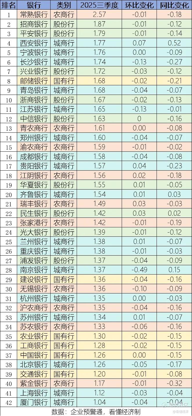 常熟银行以2.57% 的净息差高居榜首,成为行业内唯一超过2.5%的银行。招商银行(1.87%) 和平安银行(1.79%) 等头部股份行紧随其后, 作为股份行代表,分列二、三位。