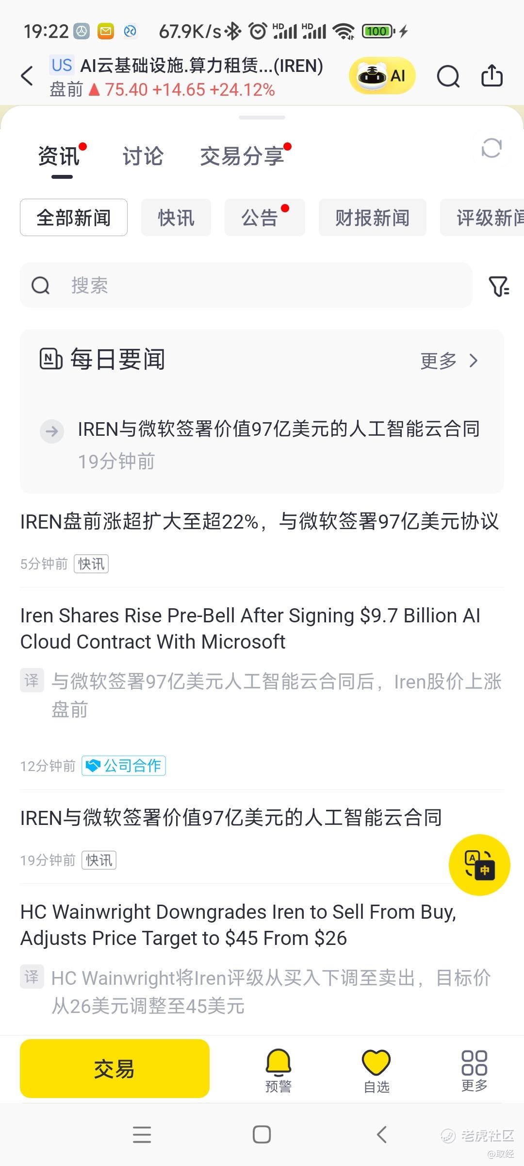 iren前以微软合作人工智能营合同97亿美元。涨20%多,已经来到76,最高78