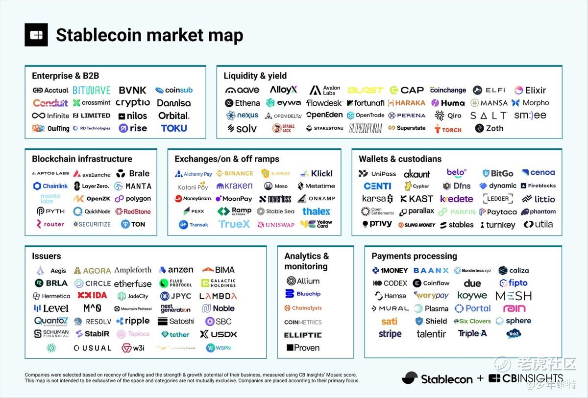 这是今年CBInsights出的一个稳定币市场地图,各个链条的核心玩家,从产业分工和上下链路来看的话,大致可以划分成以下几类: