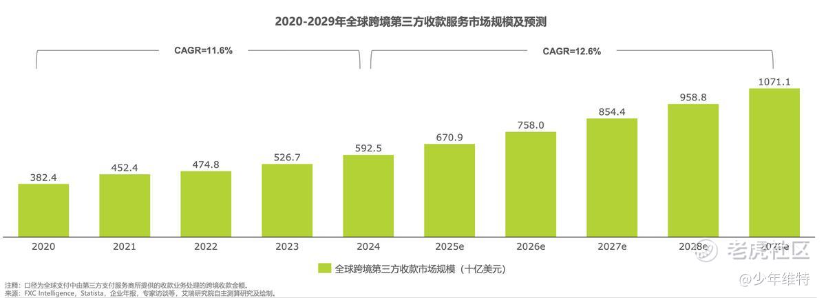 艾瑞咨询报告显示,2024年全球跨境第三方收款市场规模约6000亿美元,预计到2029年将突破1万亿美元。其中,中国跨境电商出口依然是主力——无论是独立站、亚马逊卖家还是供应链代工厂,都在找更快、更便宜的收款方式。