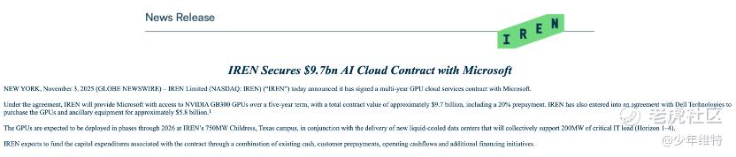 11月3号凌晨,微软和澳洲的算力运营商 IREN(Iris Energy)签了一份为期五年的合作大单,总金额高达 97 亿美元。公告一出,IREN 股价盘前直接跳涨 20% 以上——要知道这家公司今年已经涨了 480% 了,妥妥的“AI 能源赛道宠儿”。