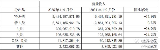 2025年前三季度,今世缘白酒产品中的“特A+”类产品(出厂指导价300 元(含税)以上)营收仅54.35亿元,同比缩水超10亿元。