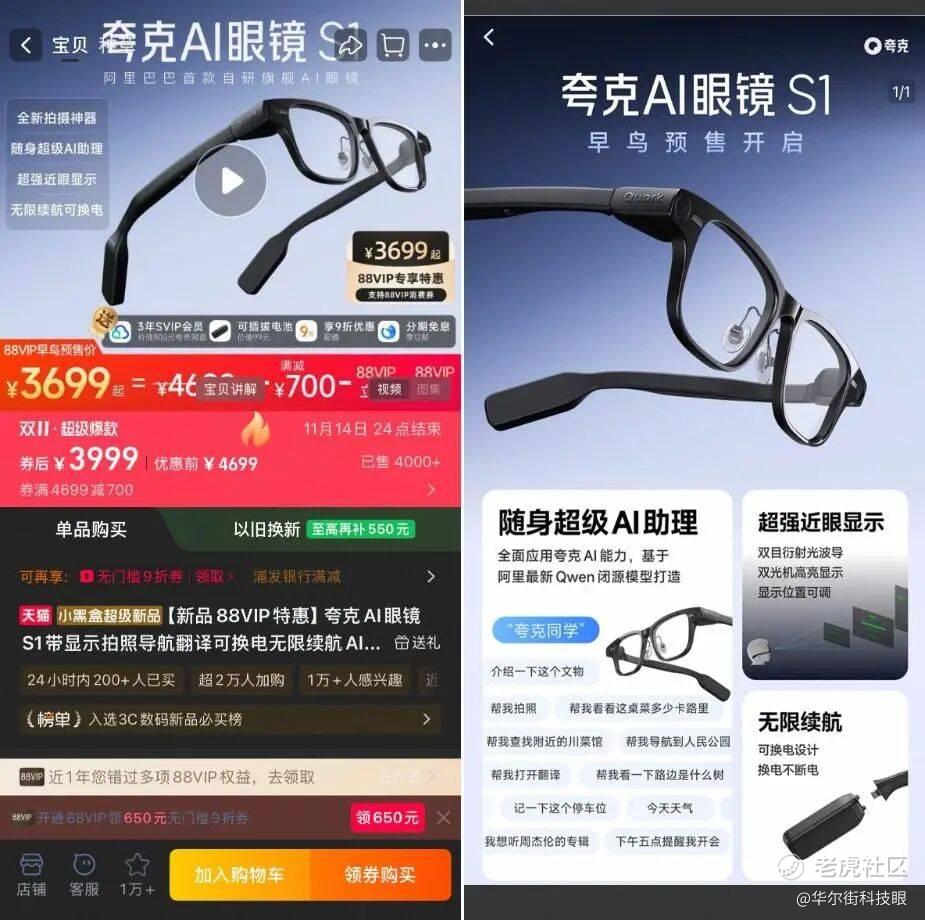 同时,作为夸克最核心的硬件载体,夸克AI眼镜S1在双11期间开启预售,售价3999元起。