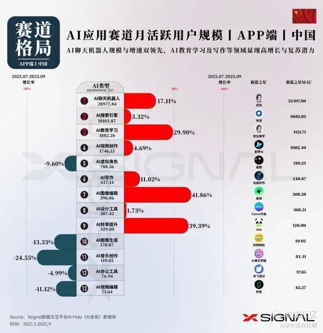 根据《Xsignal 全球AI应用行业季度报告丨2025》显示,第三季度中国AI应用9月MAU(月活跃用户)突破4.6亿,季度增长率为7.17%。在AI应用App端,豆包以2.2亿MAU登顶,夸克的MAU则在9610万左右。结合另一组来自“AI产品榜”的数据,通义App月活数仅为696万,远落后于第一梯队。