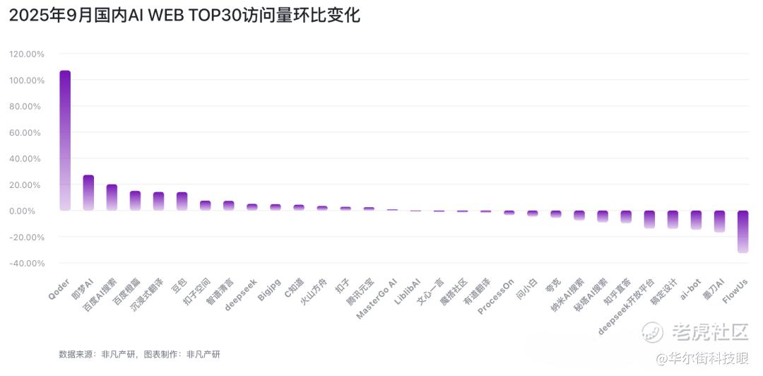 更为关键的是,夸克并非仅有手机App,还包括Web及PC浏览器版本。但市场表现,还缺乏竞争力。非凡产研数据显示,2025年9月国内AI Web端MAU总计为1.37亿,其中Top 10占据77.6%,夸克仅位列第22位,呈环比下降趋势。