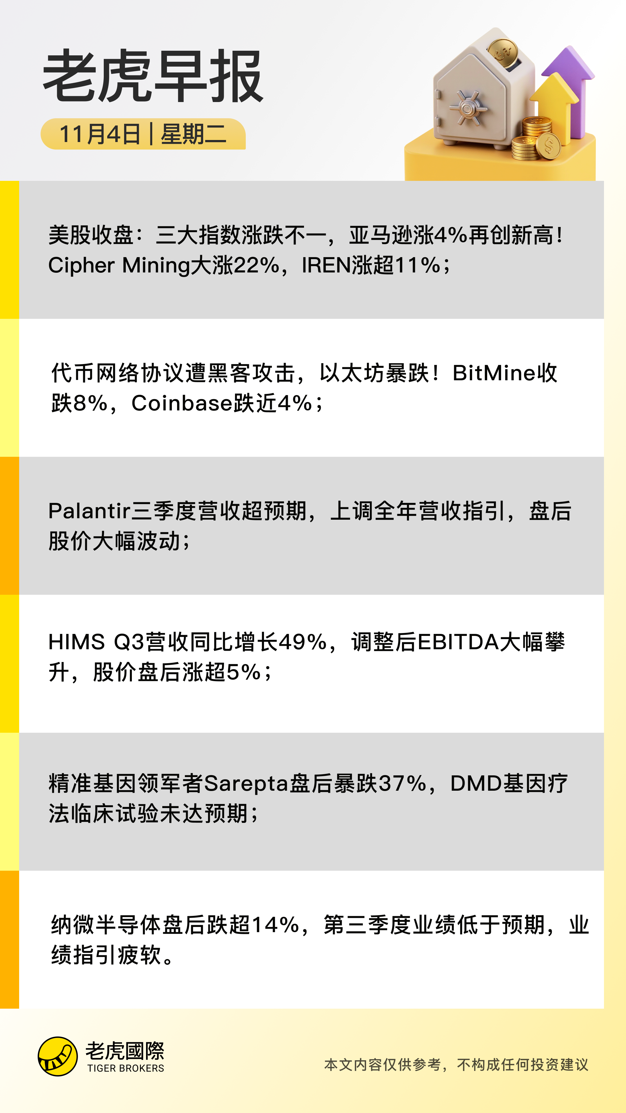 美股收盘|三大指数涨跌不一,亚马逊涨4%再创新高!Cipher Mining大涨22%,IREN涨超11%