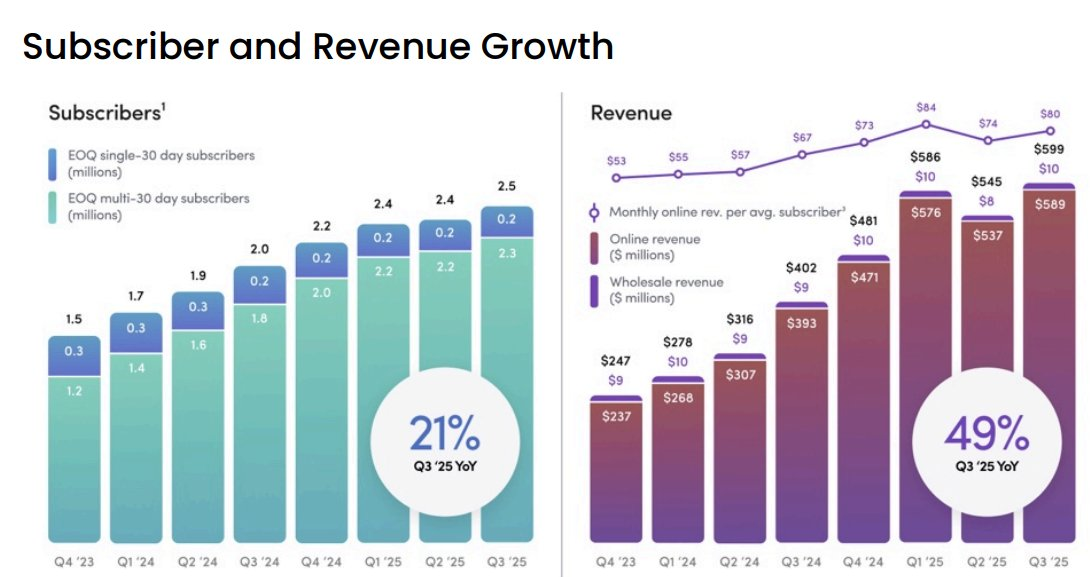 管理层对2025年第四季度和全年展望较为乐观,预计Q4营收在6.05亿至6.25亿美元之间,全年营收目标上调至23.35亿至23.55亿美元,同比增速58%-59%,指引偏向激进,隐含季度环比加速的假设,超出市场平均预期(全年约23亿美元),反映出对用户增长和产品线扩展的信心。