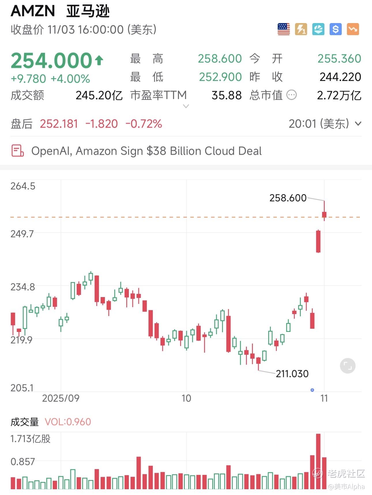 科技板块成为当日最大赢家,受AI乐观情绪提振。$亚马逊(AMZN)$ 与OpenAI达成380亿美元合作协议,推动其股价大涨4%,创下历史新高。该协议涉及云服务和AI计算能力,强化了亚马逊在云计算领域的领先地位。$英伟达(NVDA)$ 样受益于AI热潮,上涨2%,并宣布扩大在阿联酋的投资至152亿美元。其他科技股如微软也签署了97亿美元的AI计算合同,进一步点燃市场热情。