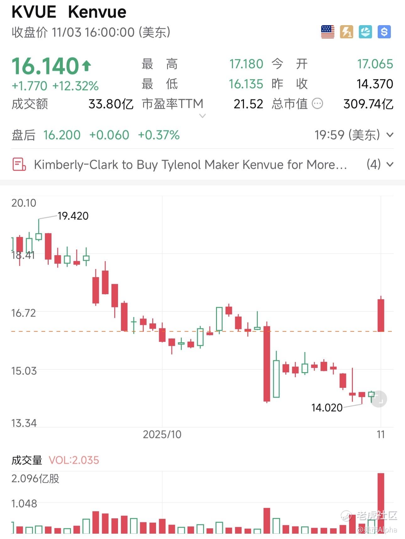 消费品板块也出现亮点: $金佰利 (KMB.US)$ 同意收购Kenvue,导致 $Kenvue (KVUE.US)$ 股价飙升,而金佰利股价小幅波动。该并购交易规模巨大,提振了相关个股。