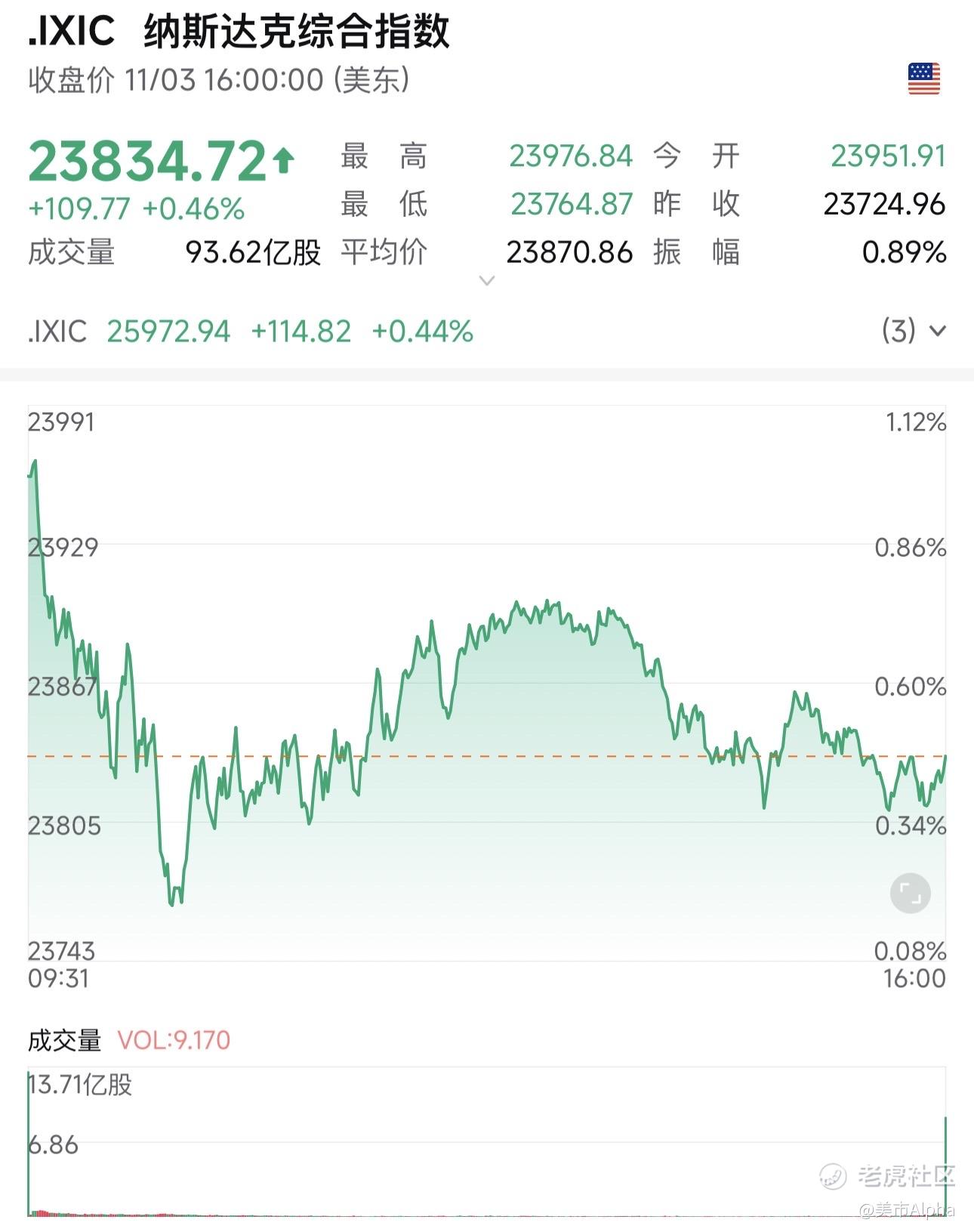 $纳斯达克(.IXIC)$ 上涨109.77点,涨幅0.5%,收于23,834.72点。该指数表现最为强劲,主要由AI相关股票推动。