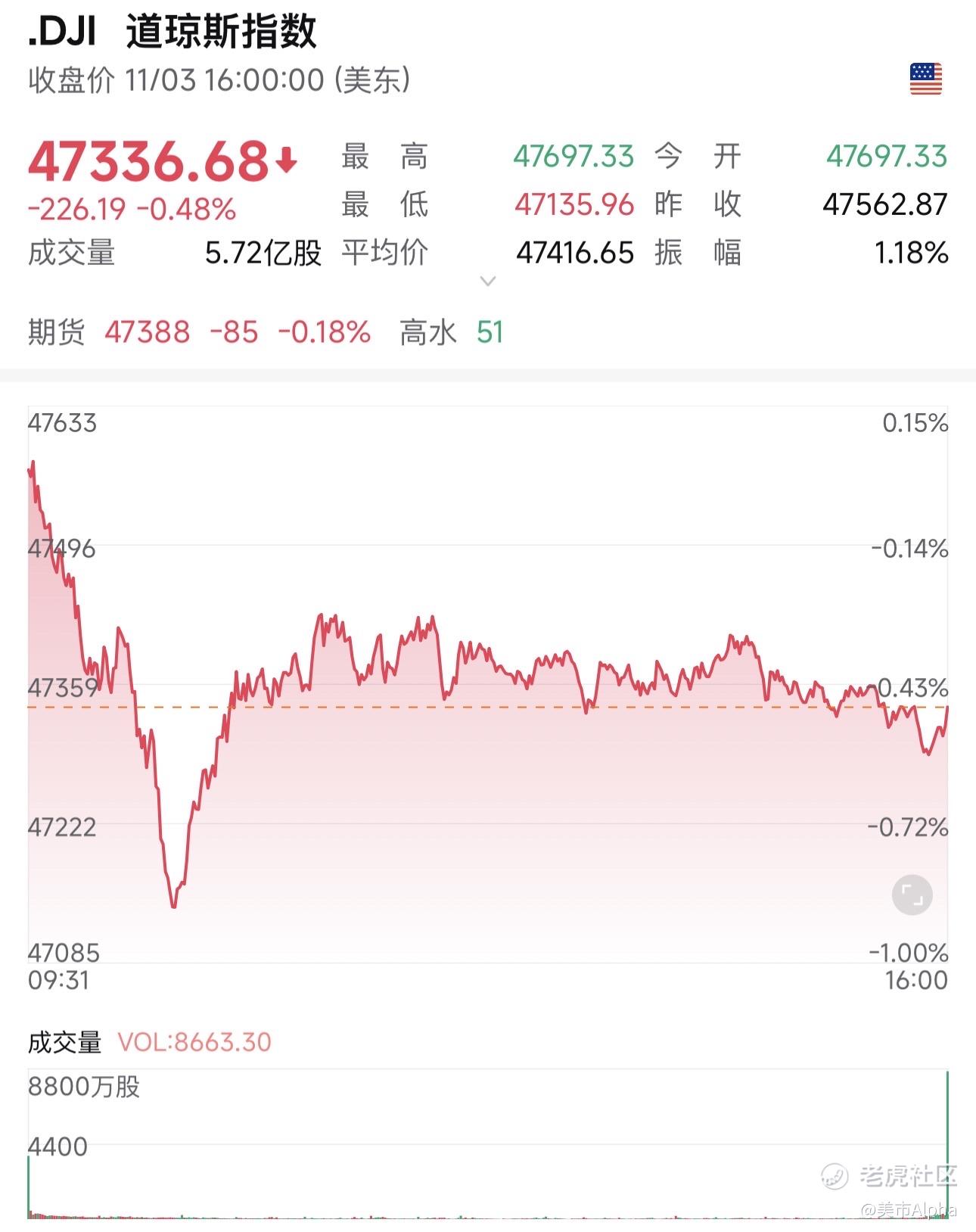 $道琼斯(.DJI)$ 全天下跌226.19点,跌幅0.5%,收于47,336.68点。该指数在交易日中一度波动,但最终未能守住涨幅,主要受非科技板块个股影响。