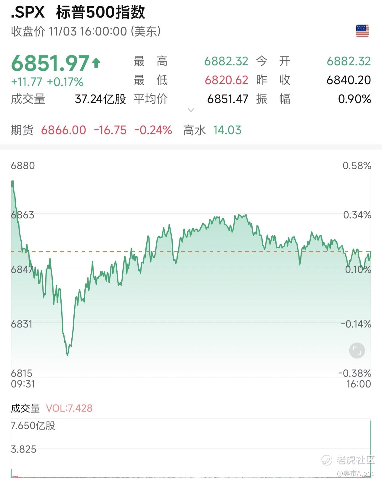 $标普500(.SPX)$ 上涨11.77点,涨幅0.2%,收于6,851.97点。该指数连续第二日收涨,得益于科技股的拉动,接近历史高位。