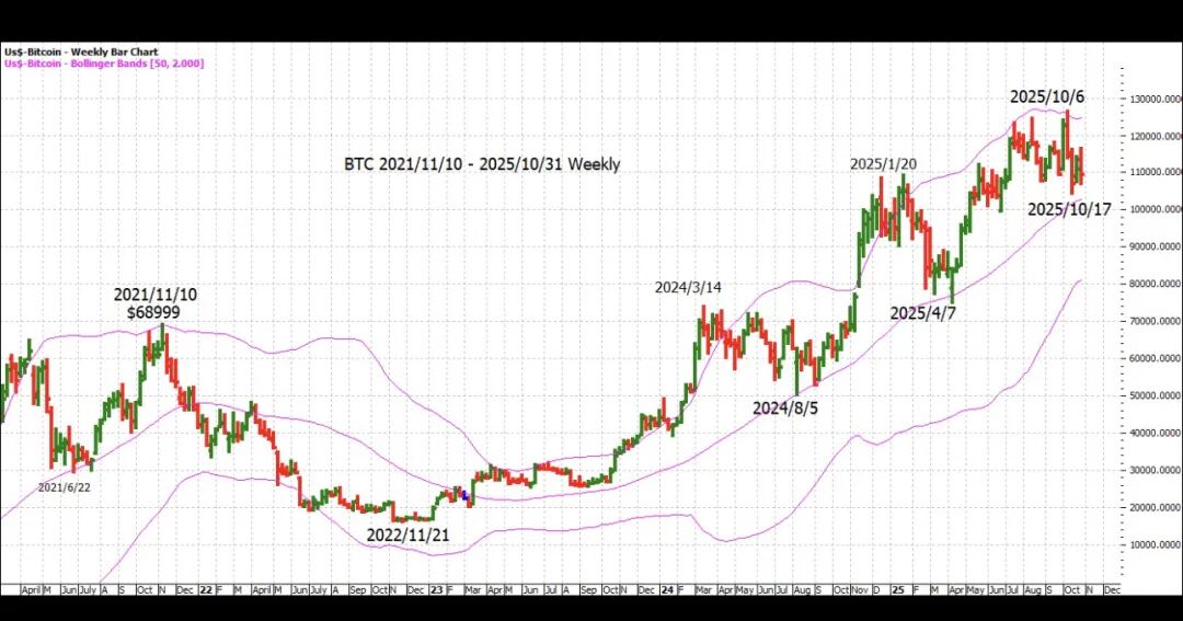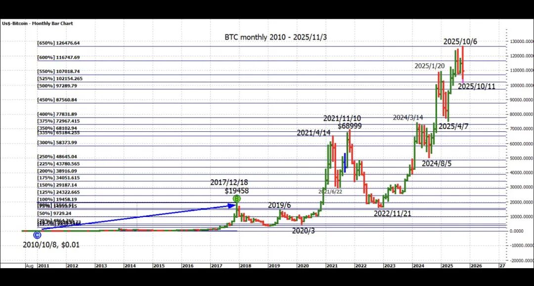 → 比特币今年10月6日从650%阻力位下跌,10月11日回踩525%阻力位$102154。