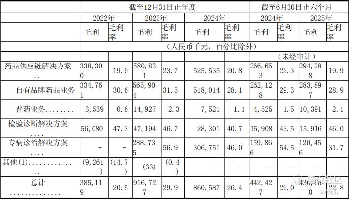 2022-2024年及2024-2025年上半年,公司营收分别为18.82亿元、30.65亿元、32.64亿元、15.26亿元及18.91亿元人民币,2023年营收增速达62.9%,2024年增速放缓至6.5%,2025年上半年同比增长23.9%。2023年高增速主要得益于基层医疗终端拓展加速,检验诊断服务覆盖范围扩大,叠加药品供应链业务规模提升,核心服务与关联产品协同带动收入增长。2024年增速放缓,系基层医疗行业竞争加剧,药品供应链业务中普药品类毛利偏低,且新业务(如专病诊治)仍处于培育期,尚未形成规模化收入贡献。2025年上半年同比增长,得益于AI技术赋能下服务效率提升,累计服务基层终端超66万家,覆盖全国99%以上县域,检验诊断与专病诊治业务收入占比稳步提升。