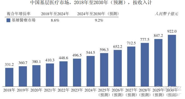 中国基层医疗市场:中国基层医疗市场规模持续攀升,从2018年的3,312亿元(人民币,下同)增长至2024年的9,220亿元,2018年至2024年复合年增长率达8.6%。受益于国家对基层医疗体系建设的持续投入、居民基层就医需求提升等因素,该市场预计将保持高速增长。2024年至2030年复合年增长率预计为9.2%,到2030年市场规模将突破1.6万亿元(根据2024年9,220亿元及9.2%复合年增长率测算),成为医药市场增长的核心引擎之一。