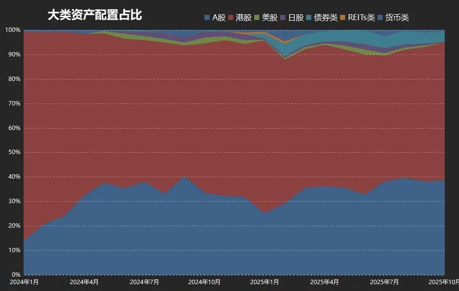 其中,A股持仓38.7%→,港股56.3%↗,美股0.1%↘,日股0.1%↘。10月看来主要是加了港股。