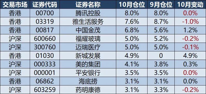 10月主要减持:华电国际电力股份H、港股红利指数ETF、雅生活服务、碧桂园服务、日经ETF、标普500ETF。