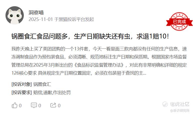 黑猫投诉平台显示,仅10月以来,关于锅圈食汇的投诉就涵盖食材生虫、生产日期缺失、乌鸡卷含骨头等问题,多位消费者依据《食品安全法》提出“退一赔十”诉求。
